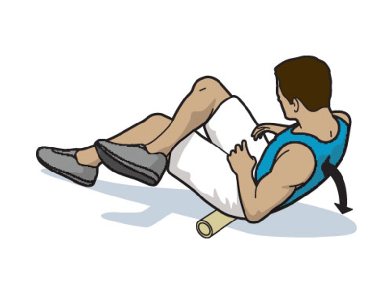 Сядь на фоам-роллер. При этом твоя левая нога касается пола, правая покоится на левом бедре. Сделай 10 наклонов туловищем назад и вперед, одновременно катая роллер туда-сюда. Это упражнение подготавливает ягодицы и бедра к приседаниям, отжиманиям и прочим более сложным упражнениям.