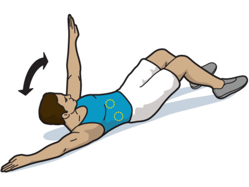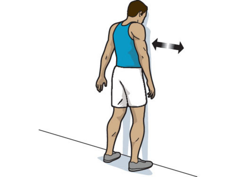 Встань лицом к стене, зажми теннисный мяч между левой грудиной и стеной. Делай движения туловищем вправо-влево так, чтобы мяч перекатывался от плеча к центру грудной клетки. Улучшает работу мышц и подвижность. Повтори упражнение несколько раз.