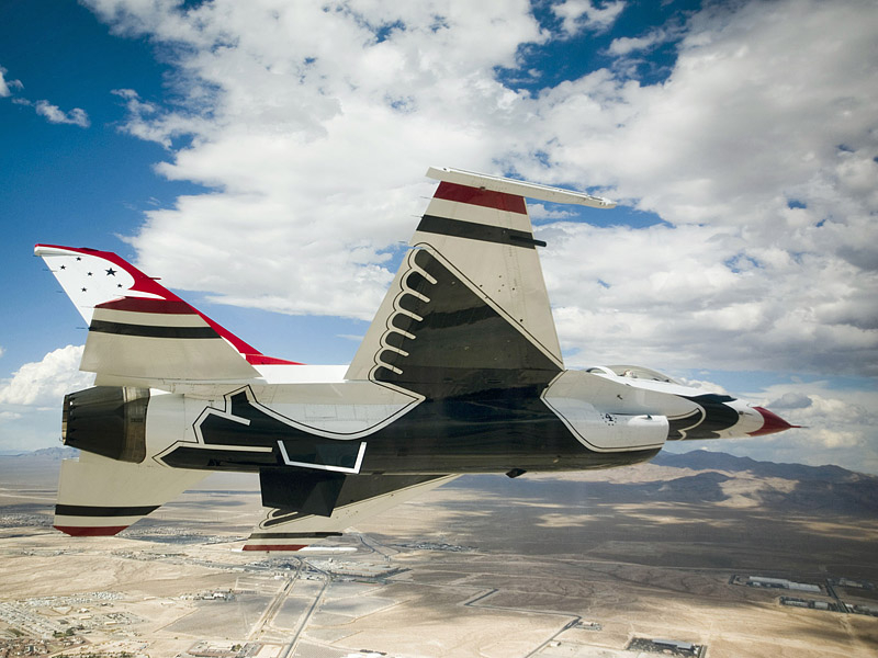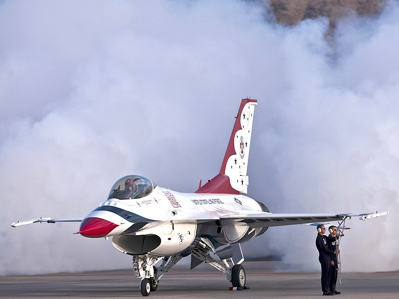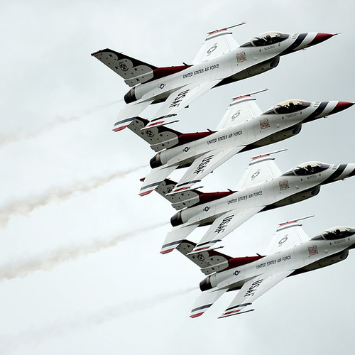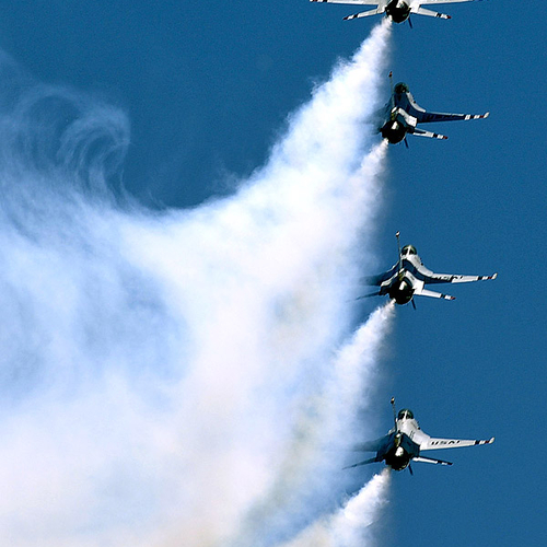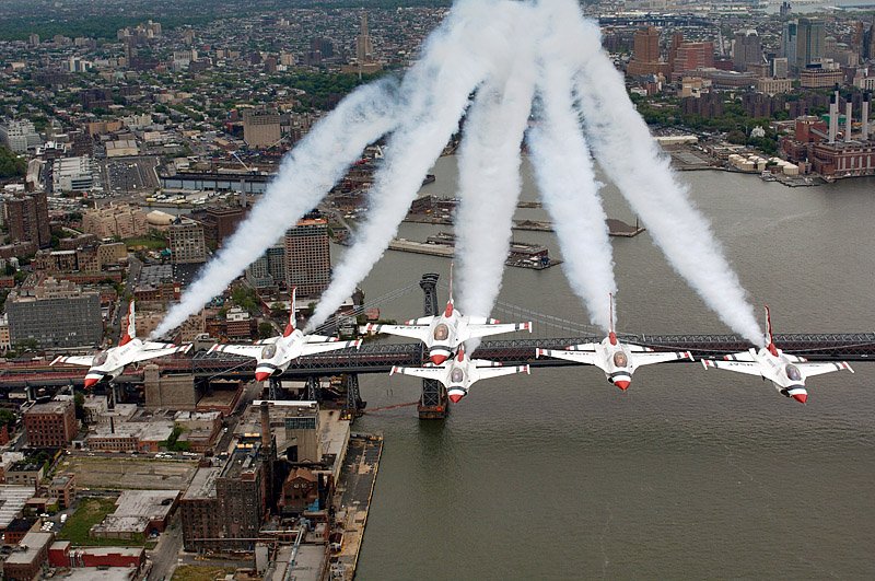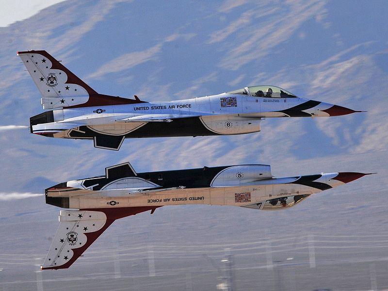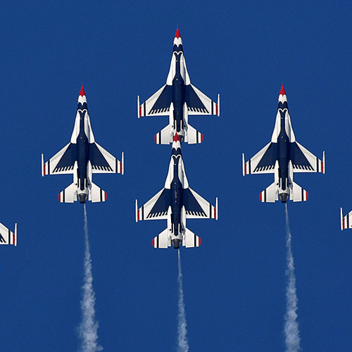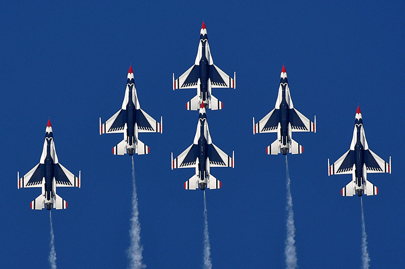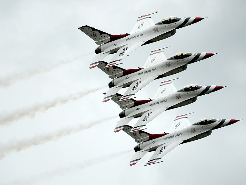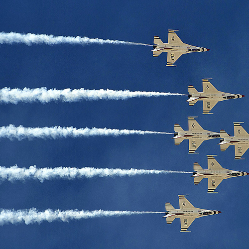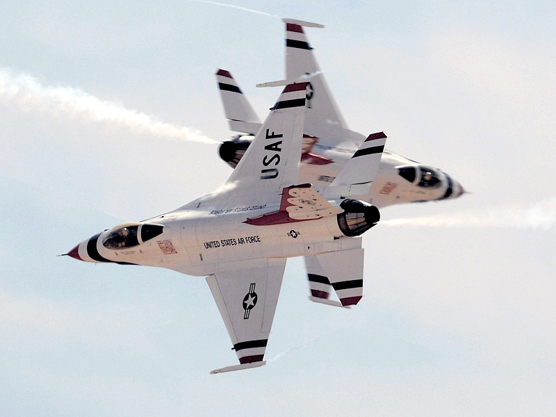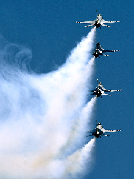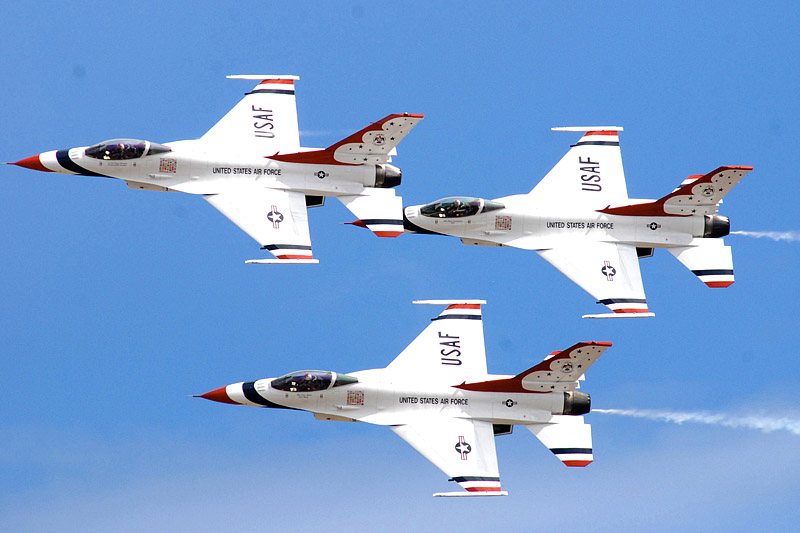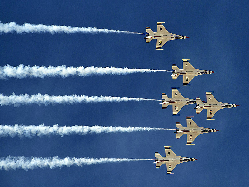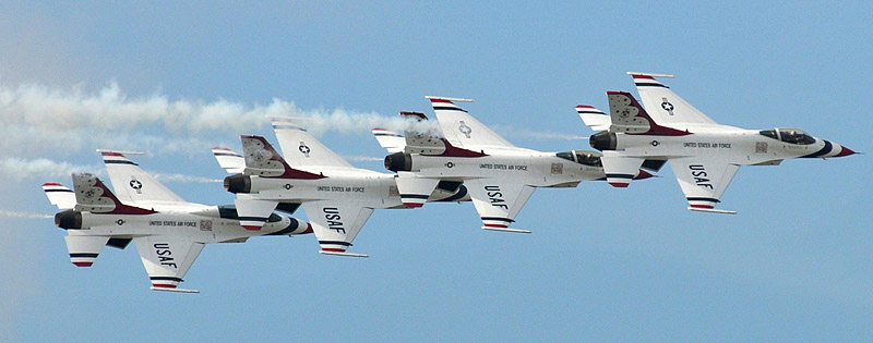 Thunderbirds выполняют массу невероятных фигур высшего пилотажа, в том числе "алмаз", "зеркало", управляемую бочку, кубинскую восьмерку. Для большего эффекта, иногда летчики сбрасывают искусственные бомбы.