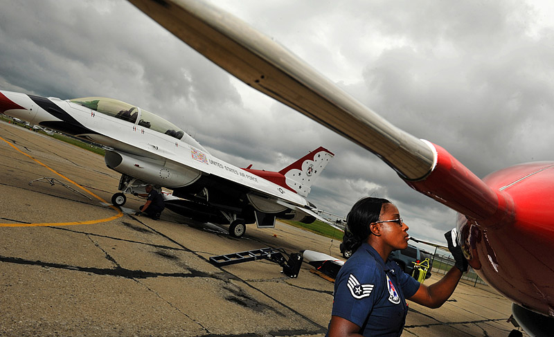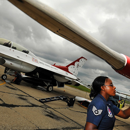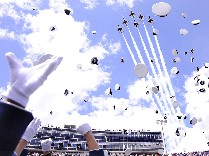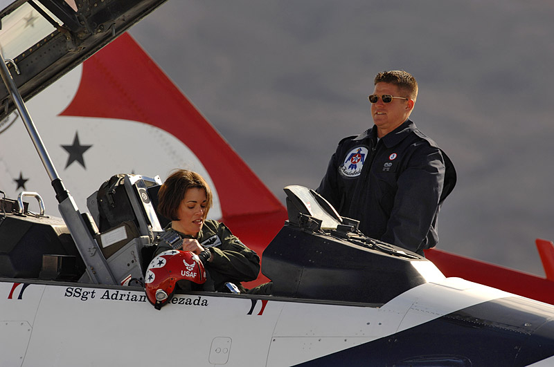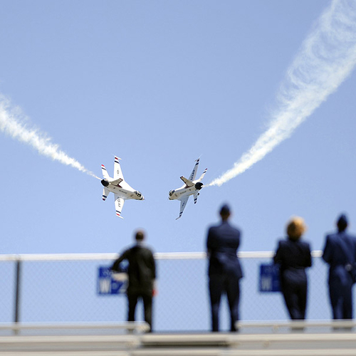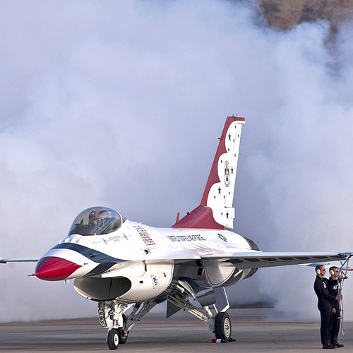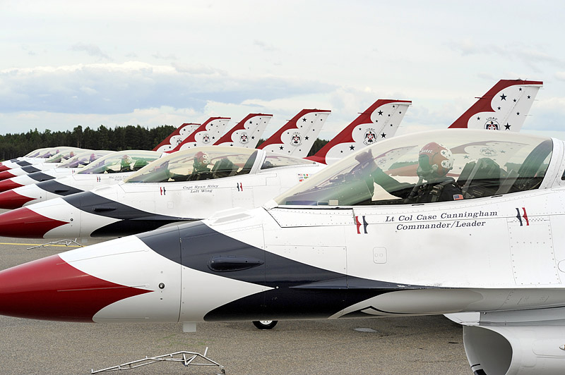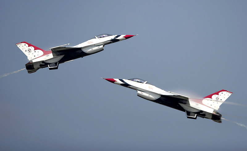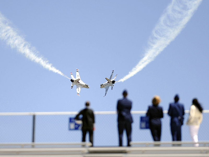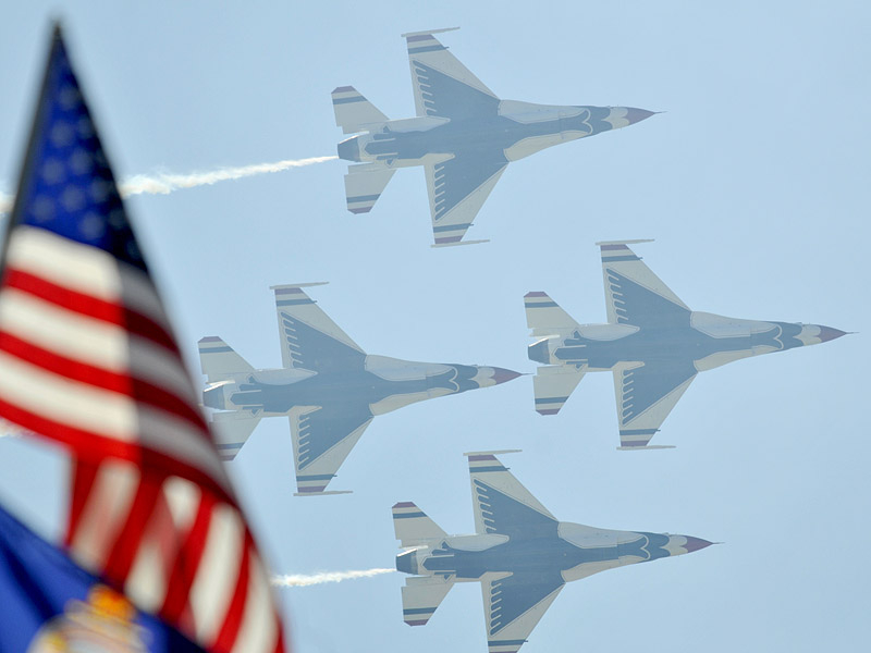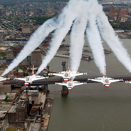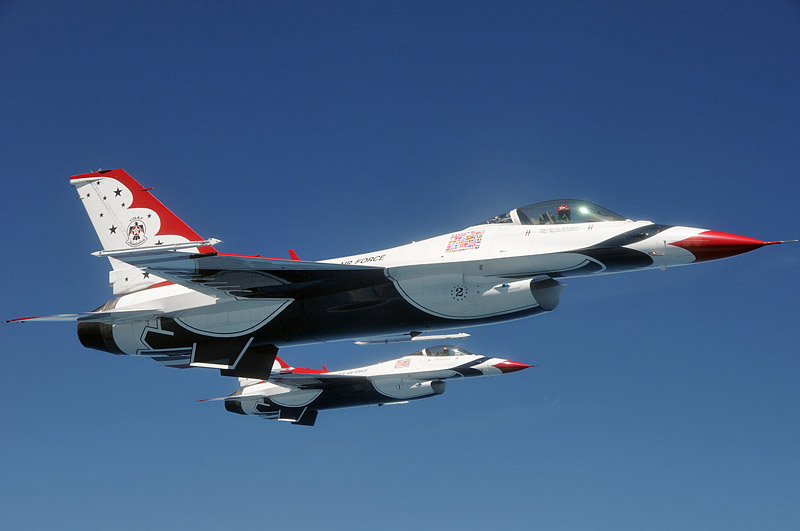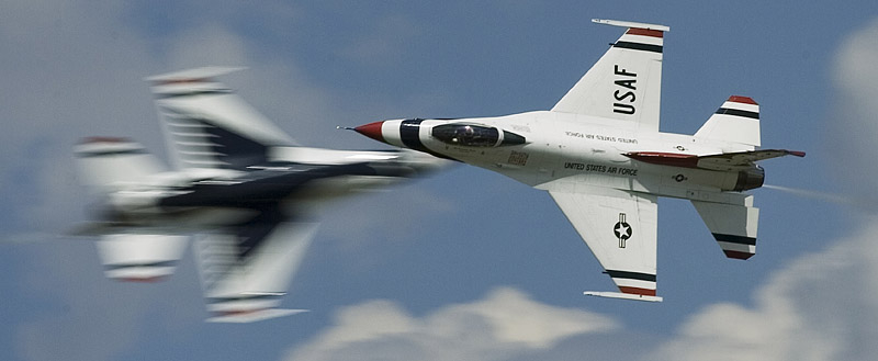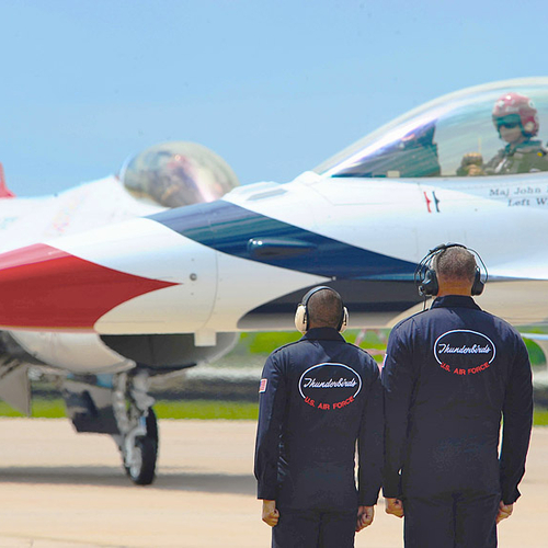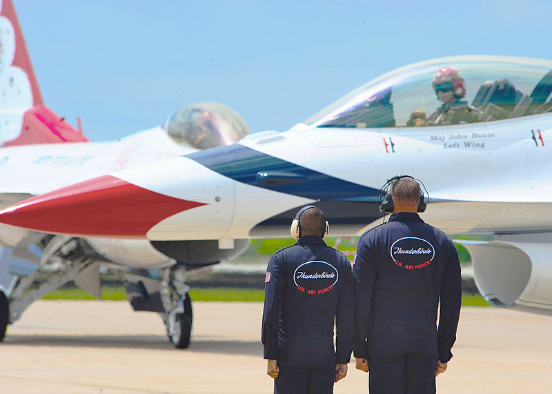 Thunderbirds выполняют массу невероятных фигур высшего пилотажа, в том числе "алмаз", "зеркало", управляемую бочку, кубинскую восьмерку. Для большего эффекта, иногда летчики сбрасывают искусственные бомбы.