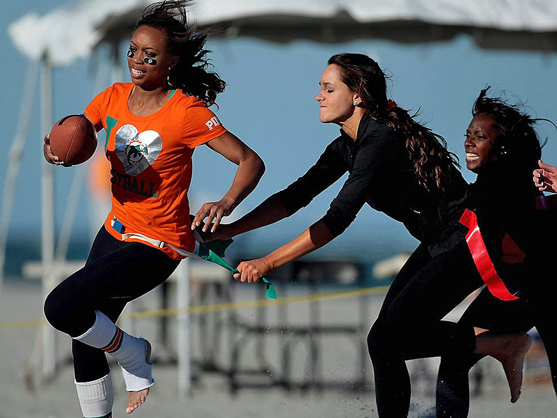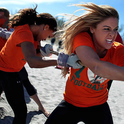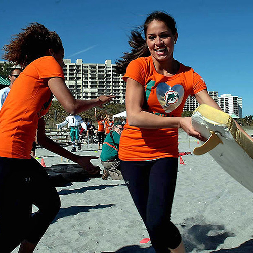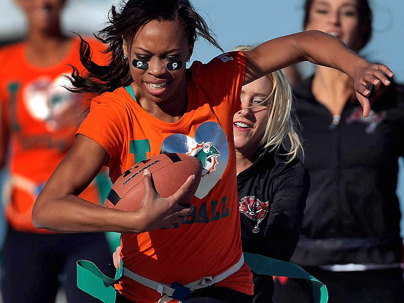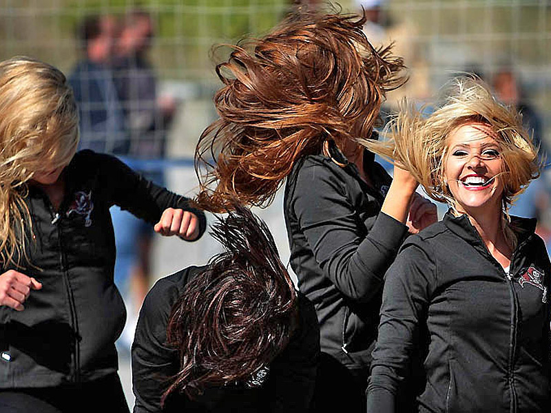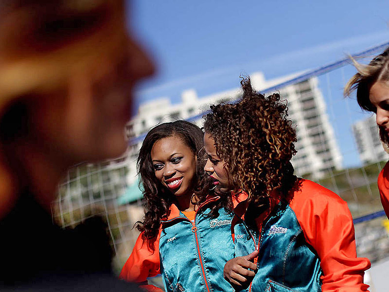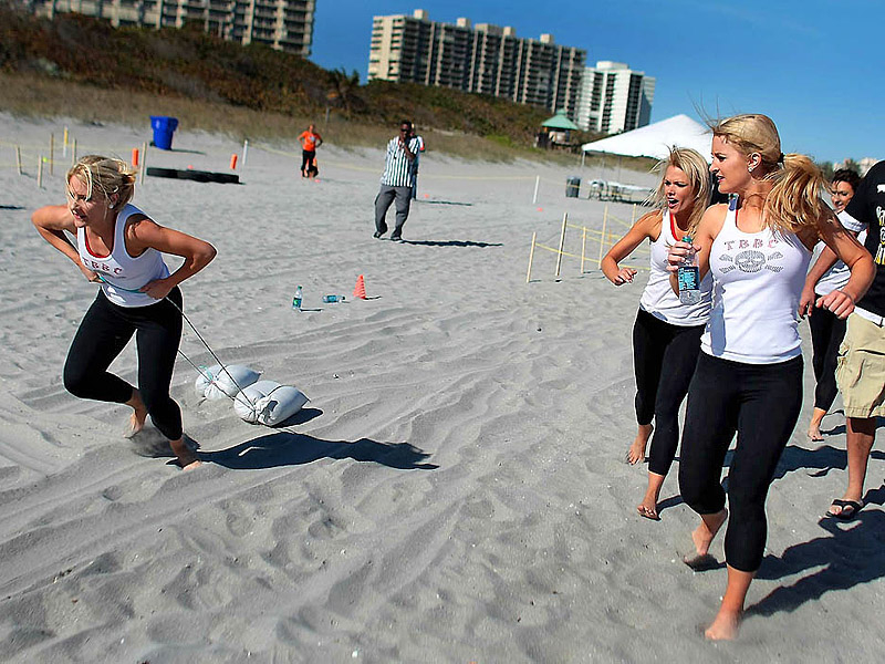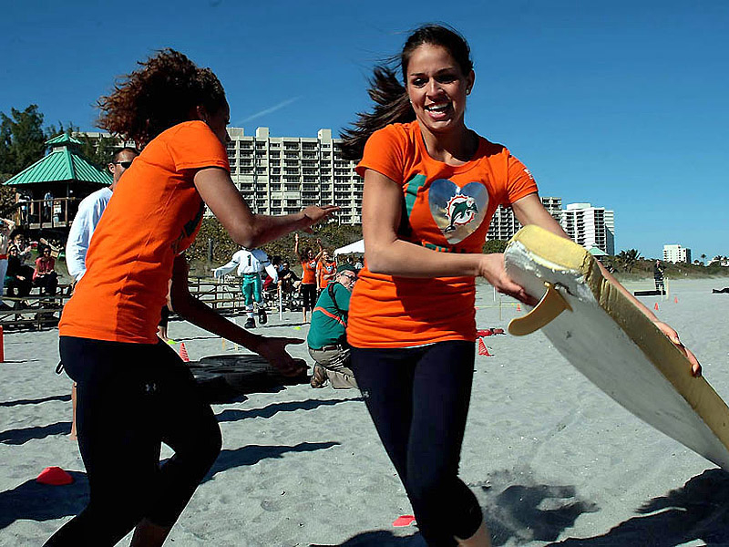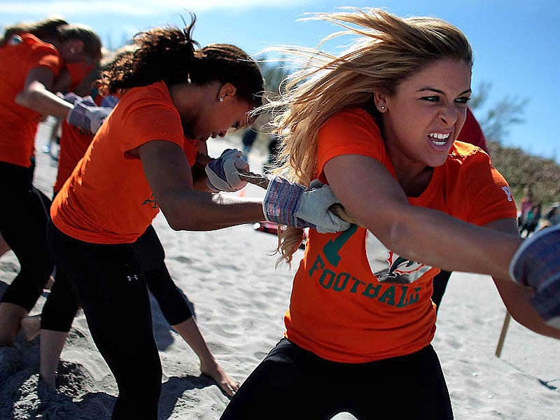 Но совсем недавно группы поддержки команд "Miami Dolphins" и "Tampa Bay Buccaneers" вышли за пределы поля и сразились между собой на пляже во Флориде. В программу соревнований входили волейбол, флаг-футбол, перетягивание каната и бег с препятствиями.