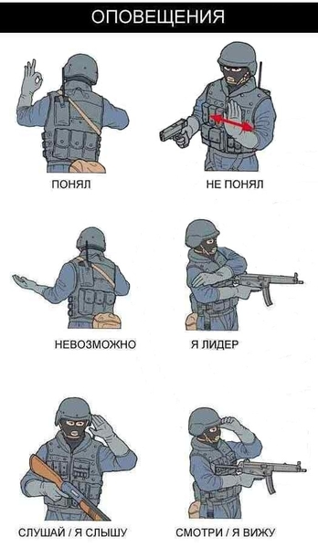Стоит отметить, что показанные здесь жесты являются универсальными для большинства подразделений в разных странах, но у многих групп есть и свои собственные жесты, которые понятны только им.