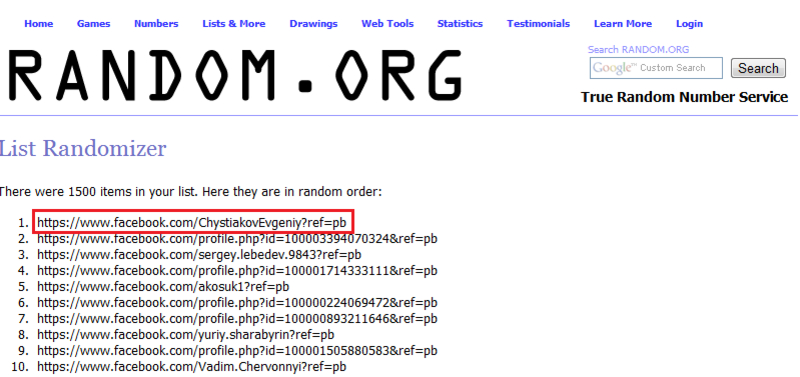 Все, что нужно было сделать участникам конкурса, "лайкнуть" нашу страничку и ожидать, когда на счетчике появится цифра 1500. Буквально накануне этот момент наступил, и мы, с помощью, рандомайзера random.org разыграли Makarov.