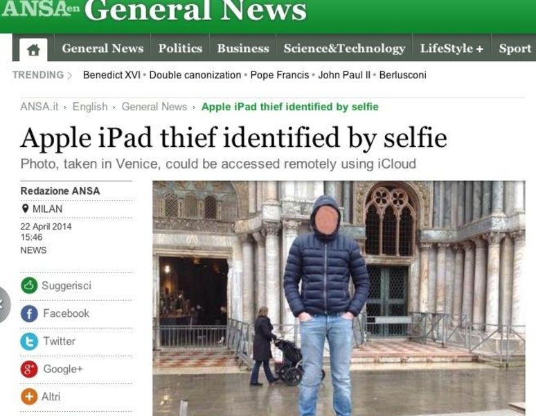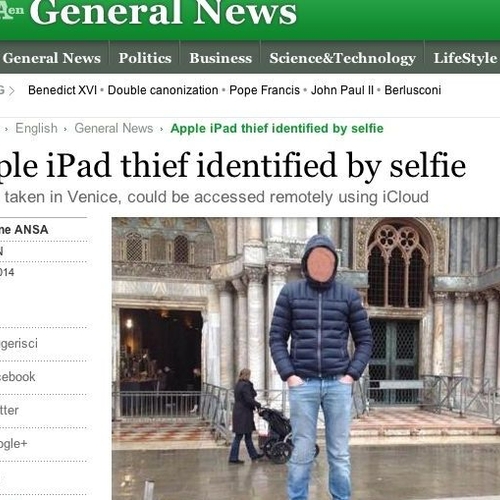 Гражданин Италии (из Милана) украл iPad и сделал с его помощью селфи. Фотография загрузилась на iCloud, после чего вора быстро вычислили и арестовали.