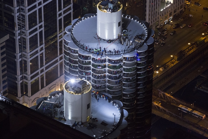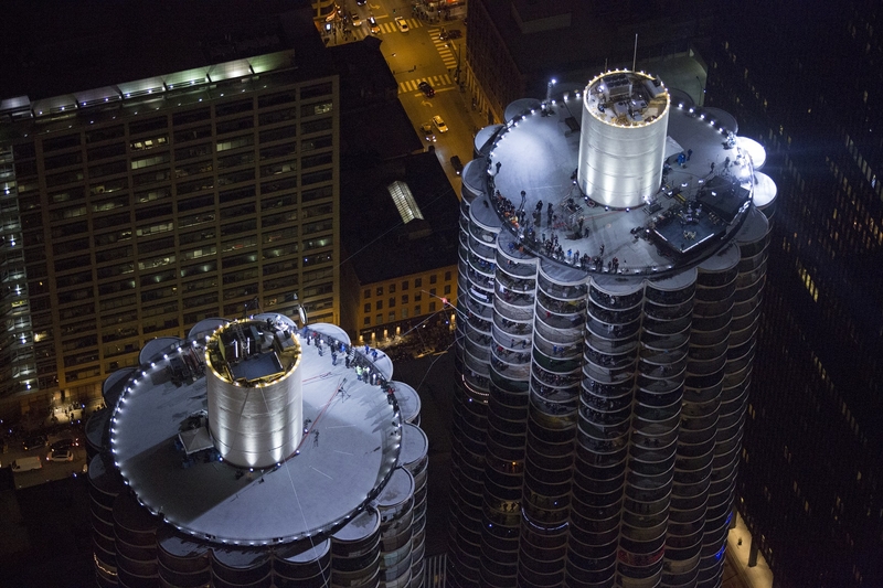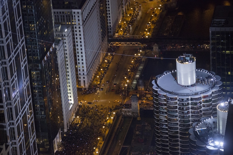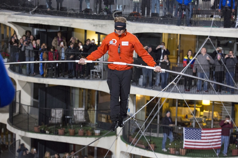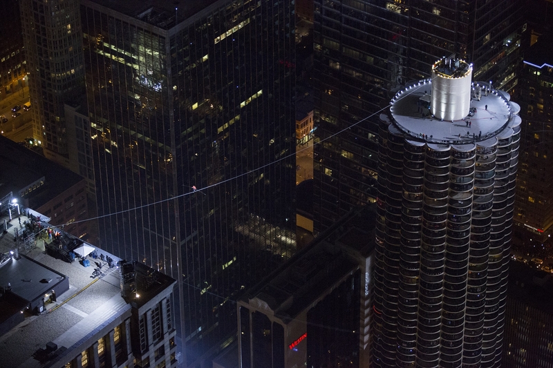 Первую часть своего пути (длиной в 2 квартала и высотой более 50 этажей) Ник прошел по наклонной - канат между небоскребами Марина-сити и Лео Бернетт Билдинг (кстати, как раз там он и был натянут под углом 15 градусов). Второй этап прогулки стал еще экстремальнее - дистанцию между западной и восточной башнями Марина-сити Валленда преодолел с завязанными глазами.