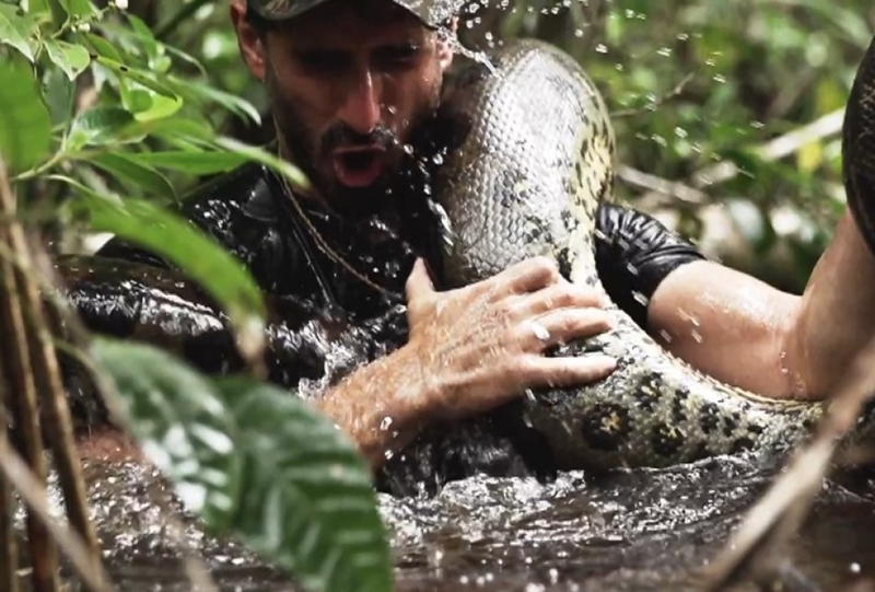 “Пусть все испытают шок, увидев, как я ставлю на кон собственную жизнь, отправляясь в пасть крупнейшей змеи на планете, зеленой анаконды“.