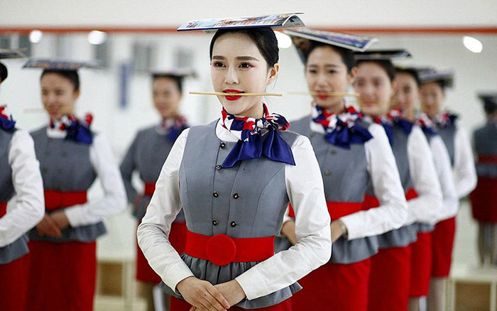 На следующих фото – студентки колледжа гражданской авиации провинции Сычуань, будущие бортпроводницы. Девочек заставляют держать: