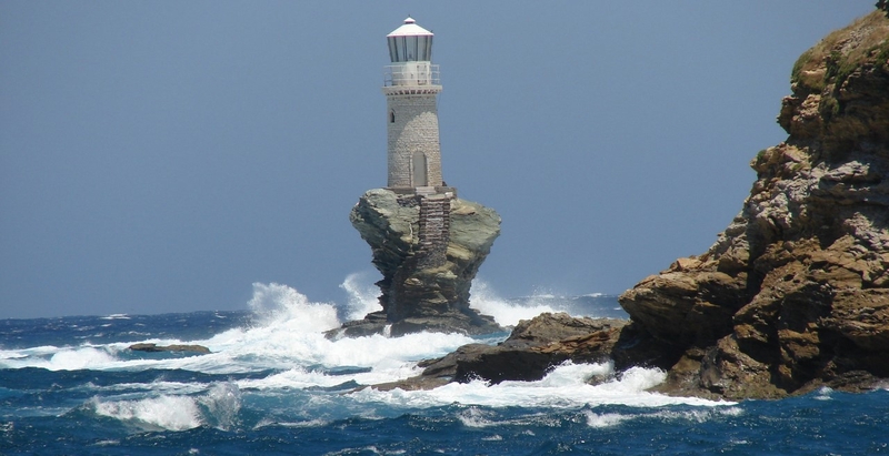 Андрос, как и любой другой уважающий себя остров (расположен в центральной части Эгейского моря), вокруг обставился камнями, торчащими из воды. Мол, намекает: без бутылки не приходи. А поскольку современные мореплаватели уже не те, то разбиться о камни могут на раз-два. Посему добрые люди и поставили на Андрос маяк — чтобы все были целы да счастливы.