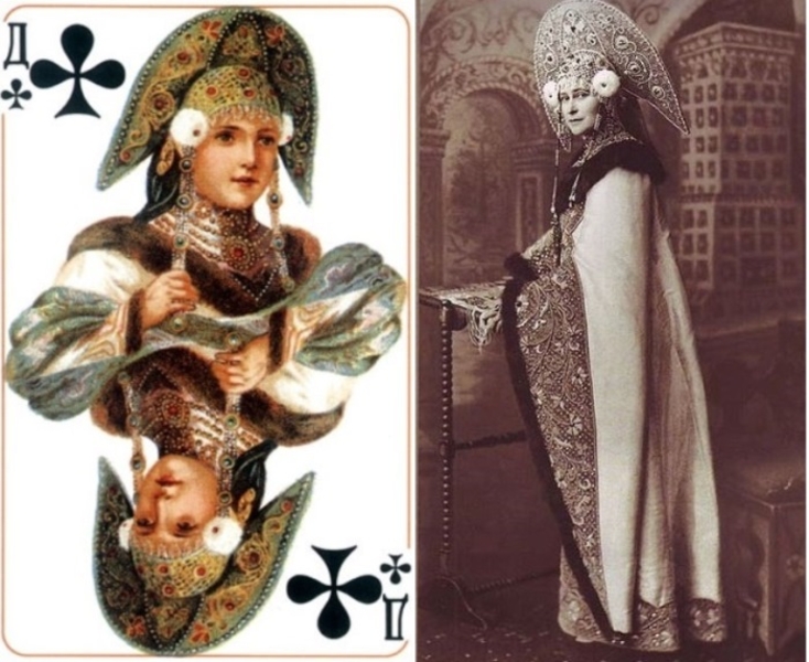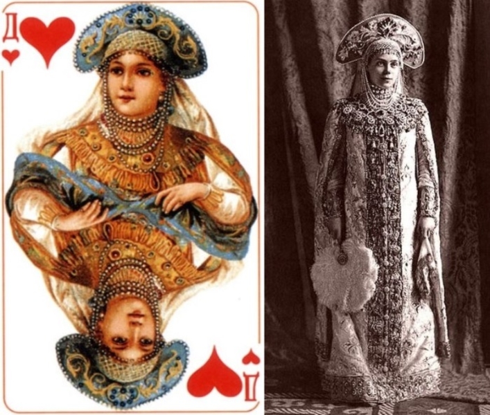И пока гости пили-плясали, царские иллюстраторы их запечатлевали. Короли, валеты и дамы на игральных картах полностью повторяют костюмы участников бала-маскарада. На тузах — щиты с древнерусским оружием / доспехами.