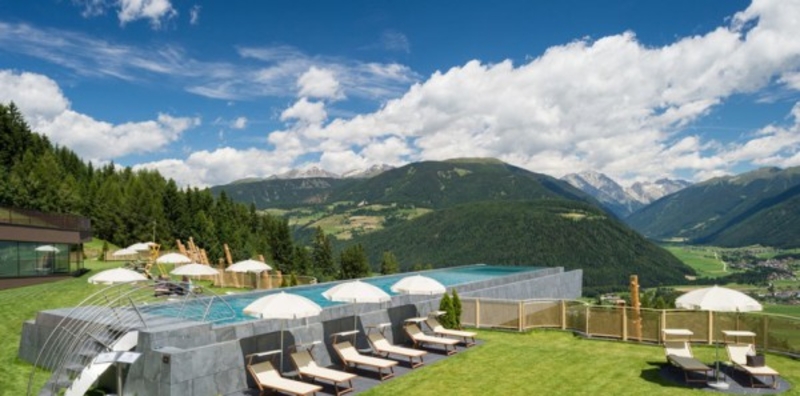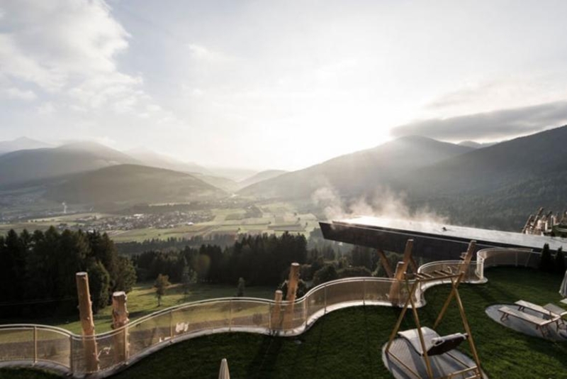 Еще одна прелесть этого экстремального бассейна — неимоверно красивый пейзаж с видом на Доломитовые Альпы. Всю конструкцию держат огромные деревянные опоры. А в самом бассейне есть еще и стеклянное окно: чтобы можно было поглазеть на эти опоры и еще больше испугаться высоты, на которой находишься.
