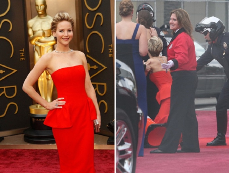 Еще один фейл с участием Дженн — церемония Оскар в 2014-м. Тогда она никаких платьев не рвала. Просто зацепилась и шлепнулась.