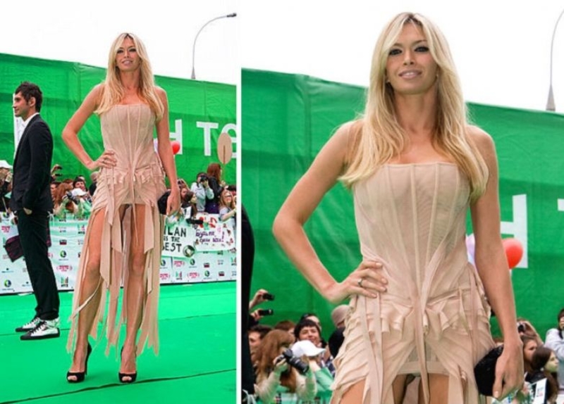 Это итальянская актриса. Дело было на Римском кинофестивале в 2015-м. Подул такой сильный ветер, что ее роскошное платьице тут же обнажило ноги и все, что чуть выше.