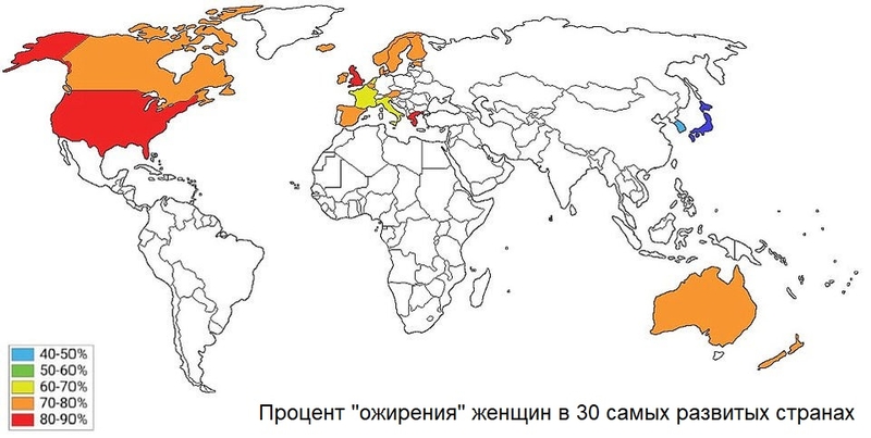 - США. Процент тамошних женщин, страдающих ожирением, достигает 80%.