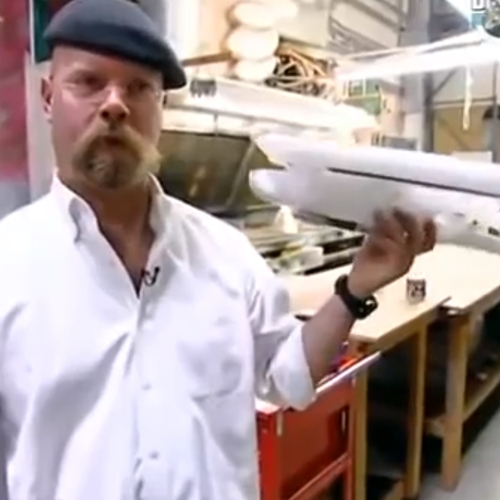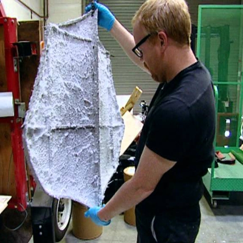 Джейми сделал макет из игрушечного планера, аккуратно смешал цемент, песок, стекловолокно и воду, из чего получились тонкие, как бумага, крылья. (После просушки вес объекта составил чуть больше 600 граммов).