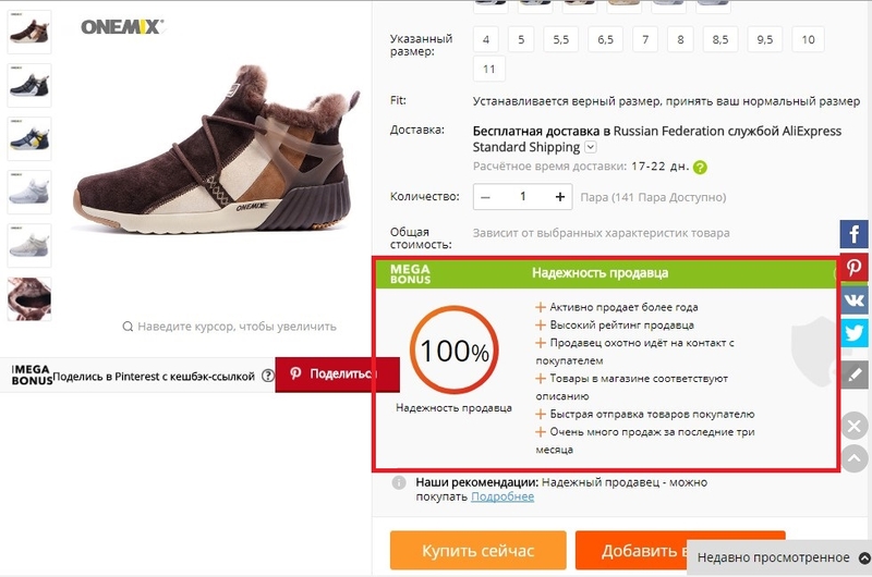 При выборе товаров, обращайте внимание на блок надежности магазина. Он отображается при активированном расширении Megabonus и показывает общую надежность продавца (цифра в процентах в красном круге) и отдельные параметры: количество лет работы на AliExpress, скорость доставки и прочее.