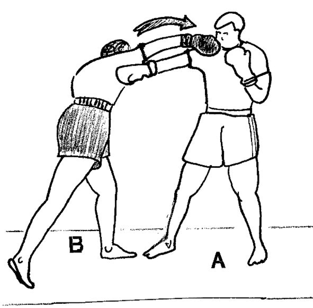 Он же хук. Слева, потому что левая рука ближе к противнику, и есть вероятность, что он пропустит. Перекидывай вес тела с левой на правую ногу, скручивай внутрь носок левой ноги, поворачивайся вправо, выбрасывая вперед единую конструкцию “бедро-плечо-локоть-кулак“. Плечо поднято (защищает челюсть), локоть согнут под 90 градусов. Кулак вертикальный (“пивная кружка“). Бей в основание челюсти.