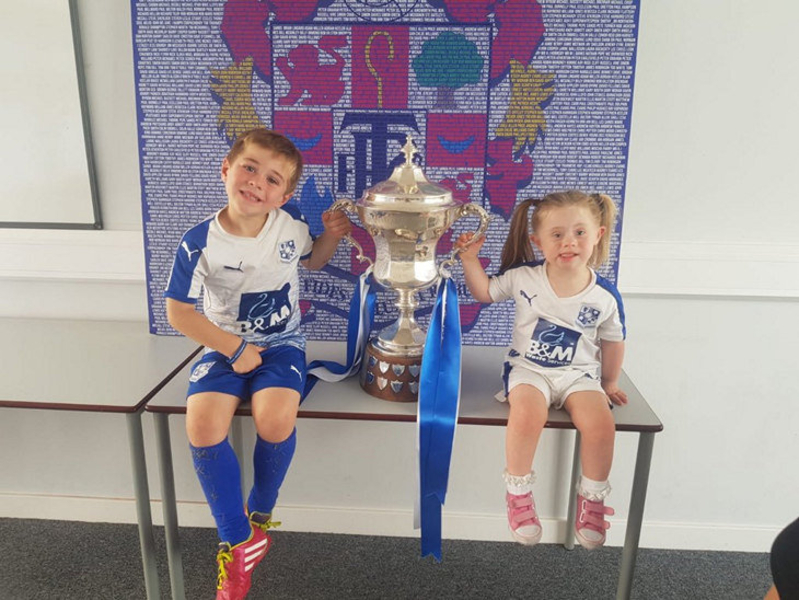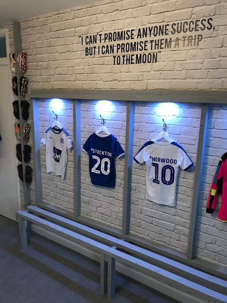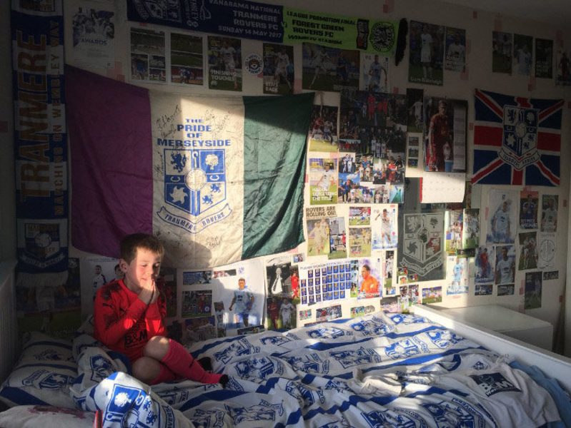 Комната сделана как раздевалка “Транмер Роверс“: клубные шарфы, постеры, тактическая доска и постельное белье с эмблемой команды. Над скамейкой висят три футболки с фамилиями нападающих клуба и вратарский свитер. Еще есть подставка для шести пар бутс. Ее отец сколотил сам.