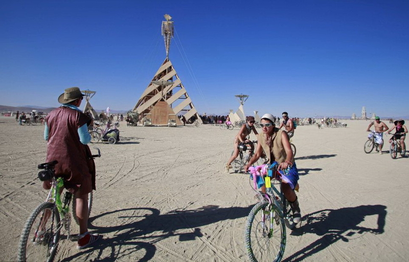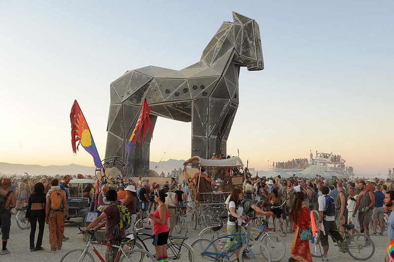 В самом деле, с одной стороны, все, что происходит во время фестиваля, очень смахивает на стандартный великовозрастный пионерлагерь с элементами анархии и всепоглощающей эротики. Хочешь – катайся на колесных яхтах по пустынной глади, хочешь – строй с таким же, как ты сам, чудаками 22-тонного «троянского коня», хочешь – возводи «геодезические купола» танцевального клуба, хочешь – участвуй в параде топлесс или внимательно созерцай загорелых обветренных красоток.