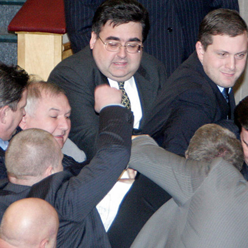 Члены партии Родина дерутся с жириновцами из ЛДПР в 2005 году. Причина столь оживленных думских прений - нечестная конкуренция двух партий на выборах в Ямало-ненецком автономном округе.