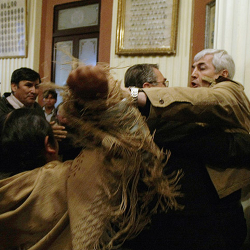 Конгрессмен от боливийской оппозиции Фернандо Родригез (справа) лупит неопознанного субъекта, который, по слухам, представляет провластные силы президента Эво Моралеса.