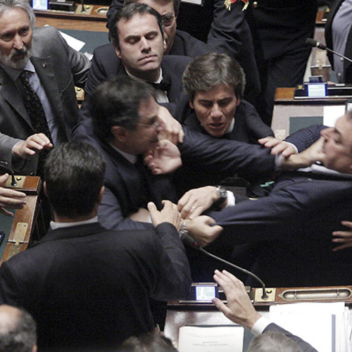 Клаудио Барбато (слева на фото) из оппозиции, буквально 26 октября подрался с Фабио Раньери, провластным депутатом итальянского парламента. Яблоко раздора - программа реформ, которая призвана сократить социальные расходы и затянуть пояса.