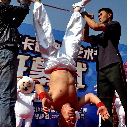 Как лучше всего вштырить, знает один китаец. Точнее, китайский каскадер Ли Чинь. Этот 47-летний атлет на днях показал едва ли не самый главный трюк своей жизни – стойку на голове с упором в заостренный штырь.