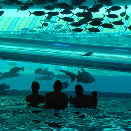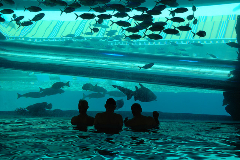 Все дело в уникальном открытом бассейне, расположенном на территории этого отеля. Он построен вокруг огромного резервуара, в котором свободно плавают самые опасные морские хищники планеты.