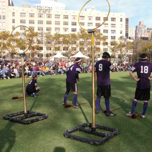 По сути, вымышленная спортивная игра. Изначально в нее играли персонажи романов Джоан К. Роулинг о Гарри Поттере, летая на метлах. Между тем, в реальной жизни есть даже Международная ассоциация квиддича, которая организует всамделишные соревнования. В матче состязаются две команды по семь игроков. Команды «летают» на метлах над овальным игровым полем, в концах которого друг напротив друга стоят ворота в виде трех круглых колец. Каждый гол, забитый в одно из колец команды-соперницы мячом-квоффлом, приносит 10 очков. Цель игры — набрать как можно больше очков до окончания игры. Игра заканчивается, когда одна из команд поймает «золотой мяч» (снитч), поэтому может длиться неограниченное время.