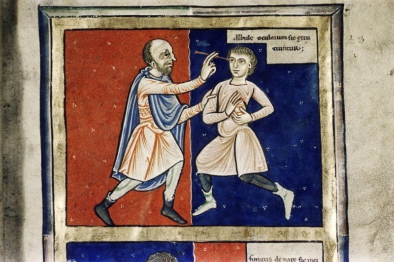 Лечение катаракты в Средневековье – одно из самых изощренных занятий. Умельцы вдавливали хрусталик в сам глаз и прокалывали склеру толстой железной иглой с отверстием внутри. Склера – это белая слизистая глазного яблока, которая часто покрывается красными сосудами, если ты мало спишь и много пьешь. С помощью иглы высасывали хрусталик наружу. Смелое решение смелых парней – вылечить катаракту полной слепотой.