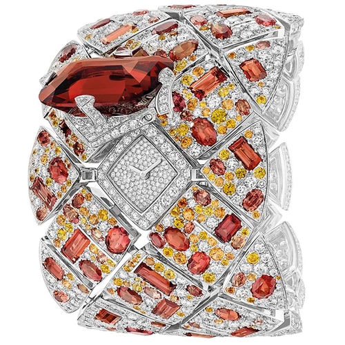 Фишка часов — огромный, но весьма элегантный браслет, “сотканный“ из драгоценных камней белого, красного и желтого цветов. Ну а вишенка на этом торте — огромный красный морганит, под которым прячется циферблат.