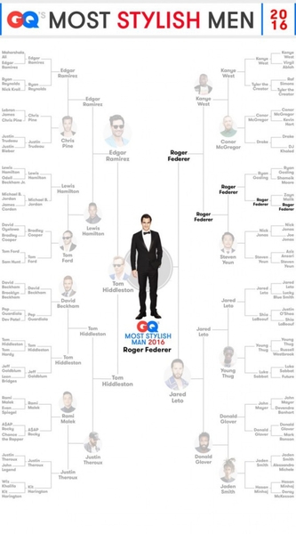 Титул самого стильного мужчины года 2016 по версии редакции GQ достался Роджеру Федереру — швейцарскому профессиональному теннисисту, бывшей первой ракетке мира в одиночном разряде