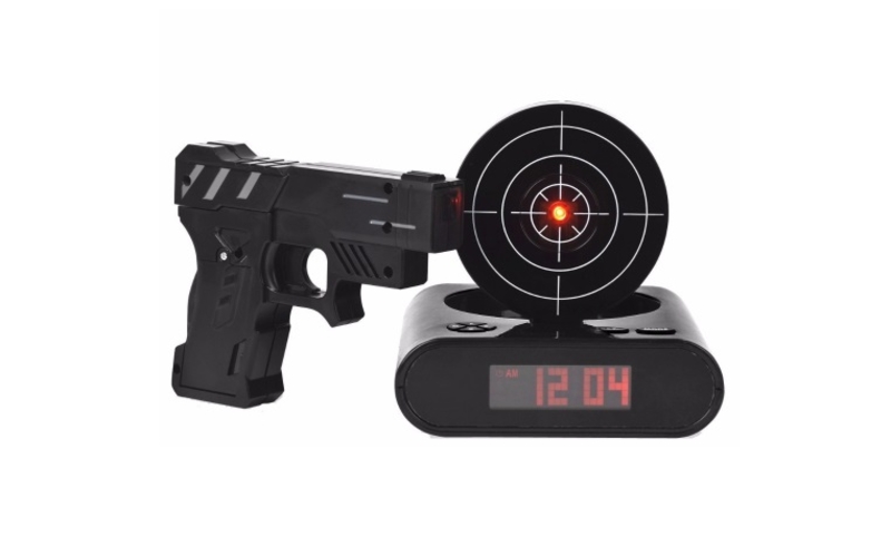 Этот будильник предназначен для того, чтобы его расстреливали. Правда, желательно из специального пистолета, продающегося в комплекте. Девайс замолкает только после меткого попадания.