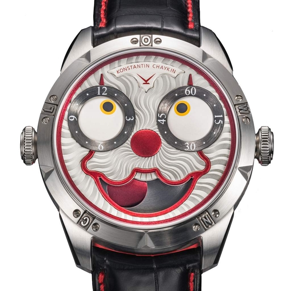 Награду за смелость получила модель часов “Клоун“ россиянина Константина Чайкина. Он создал тикающее эмодзи с совершенной начинкой: минутная и часовая стрелки тут заменены на диски “зрачков“ Пеннивайза, а индикатор лунной фазы стал красным языком механизма с ручным заводом. Всего выпущено 27 экземпляров таких часов.