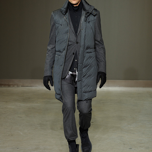 Вся коллекция модного бренда выдержана в глухих темных оттенках земляного цвета, но с необычным сочетанием разных вещей друг с другом: дутый пуховый жилет поверх классического пиджака. Но быть может и такой ход стилистов имеет право на существование.