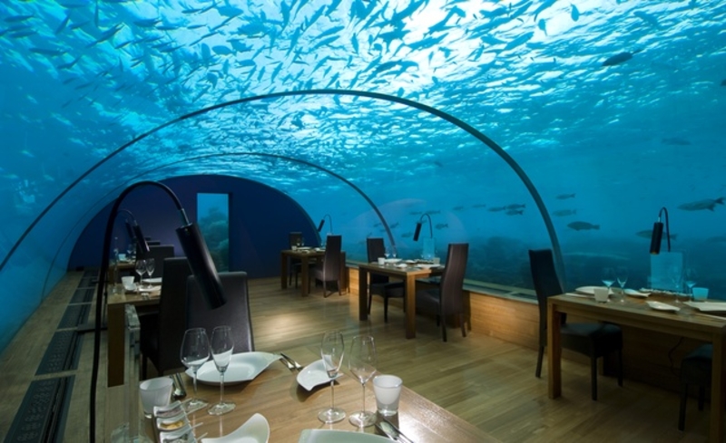 Его можно представить как роскошную «примочку» к многочисленным дайверским приспособлениям. Погруженный в Индийский океан на глубину пять метров, ресторан Ithaa в виде прозрачного стеклянного тоннеля дарит непередаваемое созерцание живописных кораллов, разноцветных рыб-попугаев и гигантских скатов. Правда, всеми этими видами могут насладиться одновременно только двенадцать посетителей…