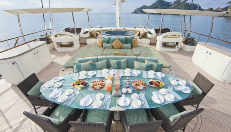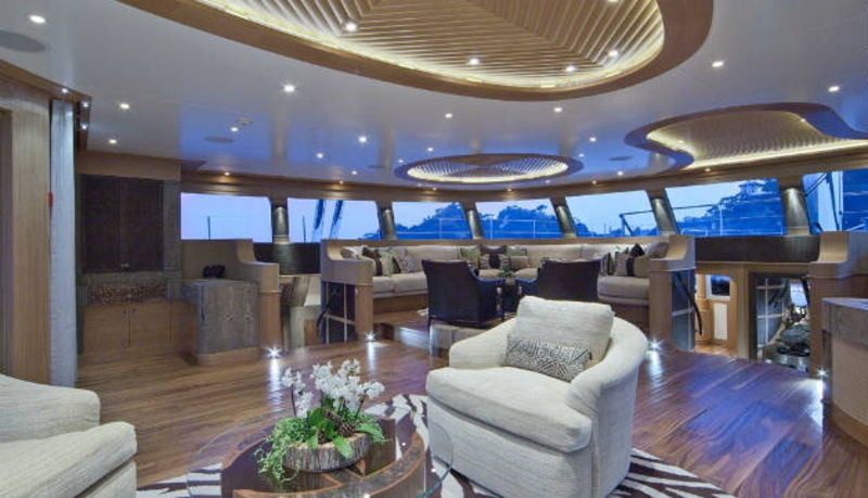 Постройка суперкатамарана заняла три года. Судостроители учли, кажется, все нюансы роскоши и капризы любителей морских путешествий. Здесь и пять уникальных кают, в том числе каюта с 360-градусным обзором. И отделка из 17 видов гранита и 16 видов кожи. И набор небольших лодок, скутеров и самого современного оборудования для дайвинга. А еще несколько ванн-джакузи для полного кайфа.