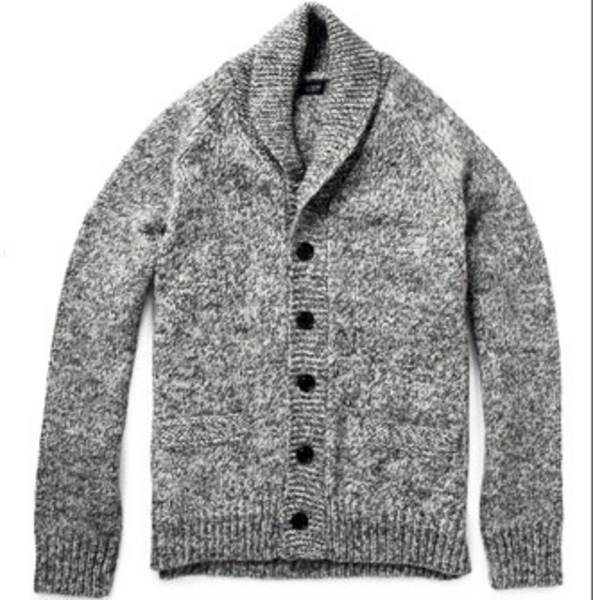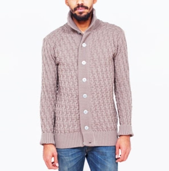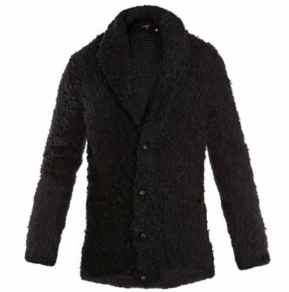 На американца John Varvatos всегда можно рассчитывать в плане мужественных и одновременно изящных вещей. Шерстяной буклированный кардиган цвета угля сделан художественно растянутым и «всклокоченным», будто служил владельцу долгие годы.