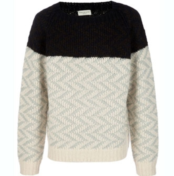 Гибридные свитера характерны для осенней-зимней коллекции Дриса Ван Нотена. Белый цвет одной части свитера удачно контрастирует с коричневым в другой, и в целом модель с зигзагообразным рисунком кажется сделанной специально для эталонного альпийского инструктора.