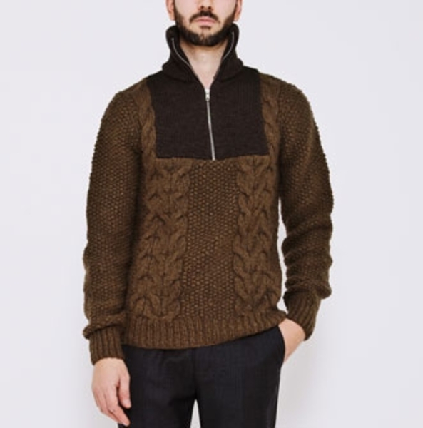 В шерстяном свитере Maison Martin Margiela соединяются два цвета и два разных типа вязки. Шоколадного цвета воротник должен выглядывать из-под пальто, а если снять верхнюю одежду, обнаружится более светлая часть с вывязанными узорами. Все вместе должно, видимо, производить впечатление оригинальной вещи домашнего изготовления, на которую не хватило однотонной пряжи.