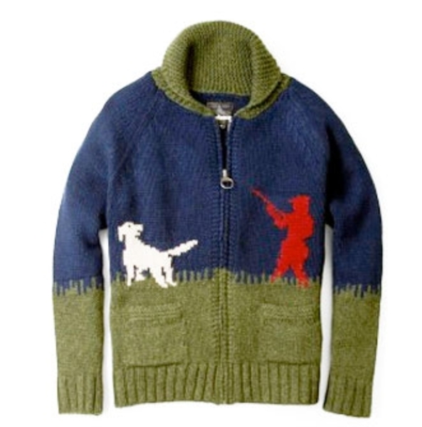 Почтенная британская компания с более чем столетней историей, Barbour специализируется на вещах, в которых можно стойко выдержать пронизывающие шотландские ветра и жизнь в малоотапливаемых английских домах. Про кардиган из стопроцентной шерсти, украшенный охотником, собакой и лужайкой, можно подумать, что он связан любящими родственниками.
