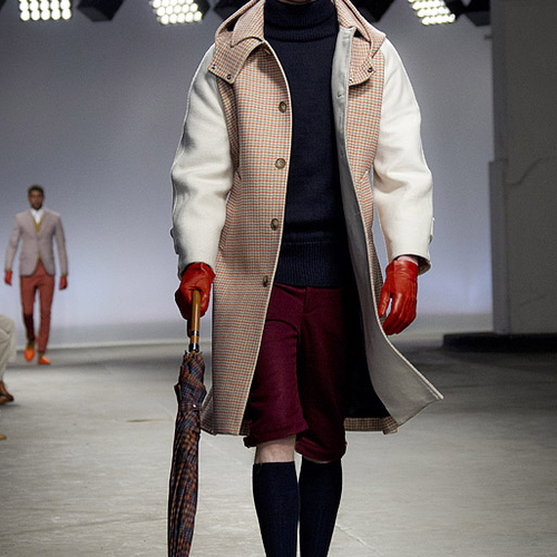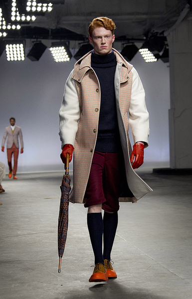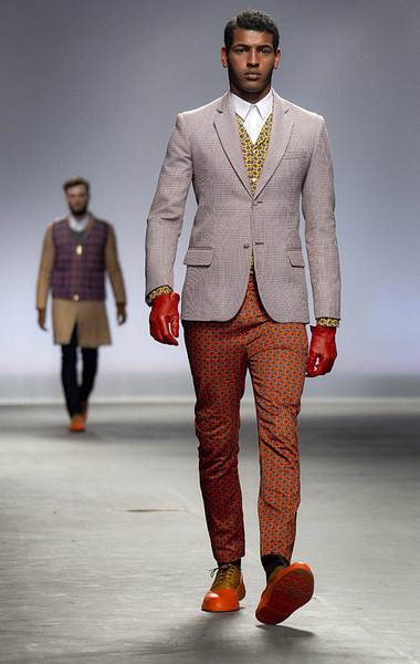 Было на подиуме все и практически на любой вкус. Сдержанно-строгий парад любимого многими английского стиля со всеми этими умеренными плащами и пальто, с традиционными клетками и солидными тканями перемежался взрывной одеждой в стиле унисекс в виде не то женских юбок, не то мужских шотландских килтов, шортами с оборками, разноцветными обтягивающими костюмами и необъятными вязаными джемперами и рукавицами-гигантами.