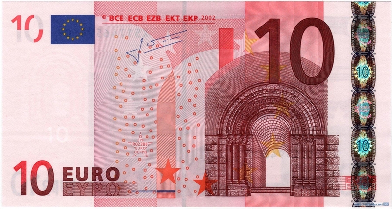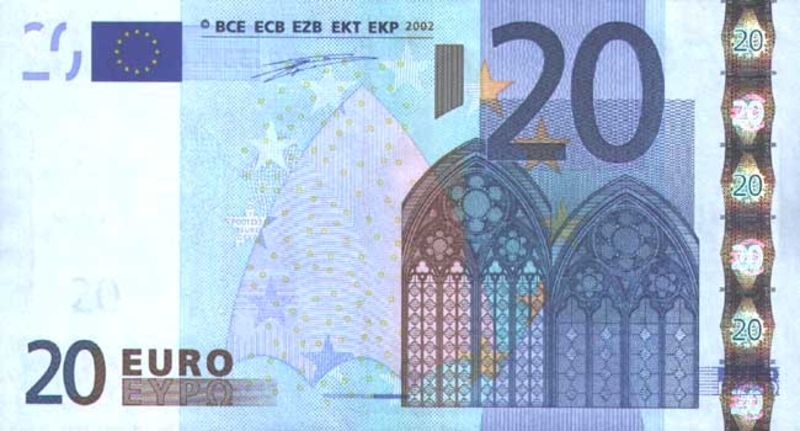 На “бумажках“ евро изображены примеры европейской архитектуры различных стилей и периодов истории. На лицевой стороне нарисованы окна и ворота, на обратной - мосты.