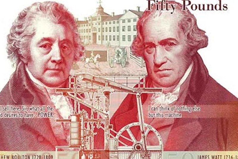 А со 2 ноября 2011 года в обращении появились 50-фунтовые банкноты с изображением изобретателя парового двигателя Джеймса Уатта и промышленника Мэтью Болтона.