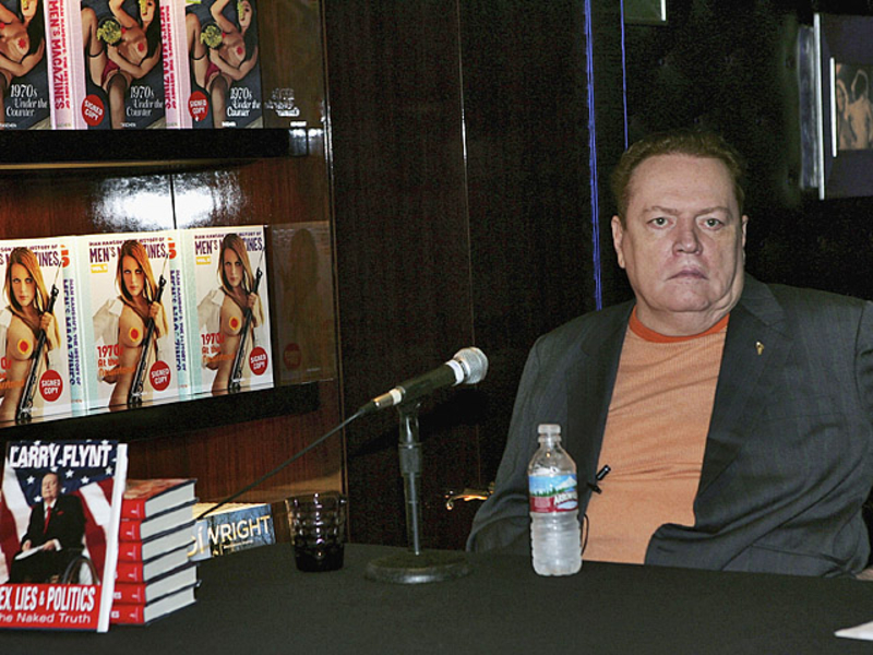 Причем делал это в своем стиле - сверхэпатажно. Например, в 1984 году Ларри Флинт одел американский флаг как подгузник и явился в суд без штанов, за что, конечно же, был наказан.