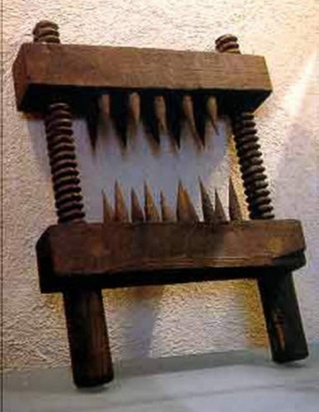 Своеобразный пресс с шипами, закрепленными сверху и снизу конструкции. Между ними вставляли голени, колени, руки тех, кого пытали. И начинали сжимать. Для усиления боли шипы сильно нагревали. Как ни странно, это устройство относилось к легким пыточным дивайсам.